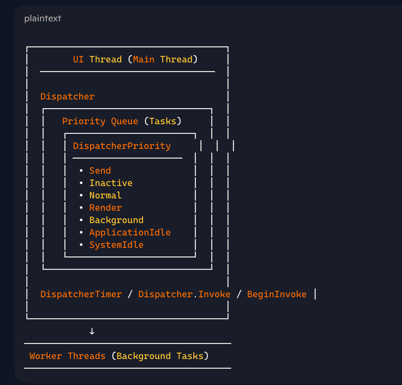 WPF에서 사용하는 `Dispatcher` 구조는 UI 스레드에서 작업을 안전하고 순차적으로 처리하기 위한 핵심 메커니즘