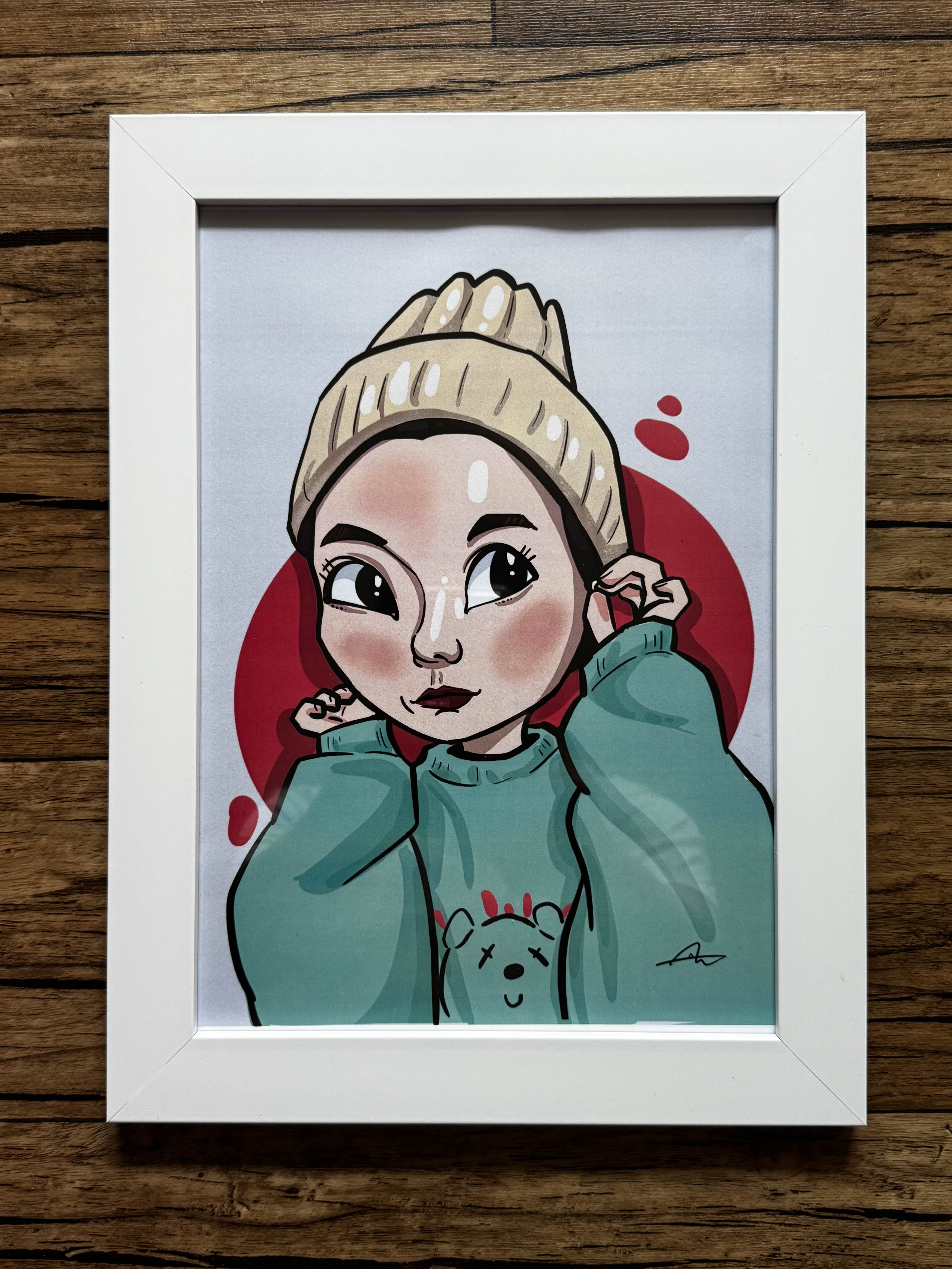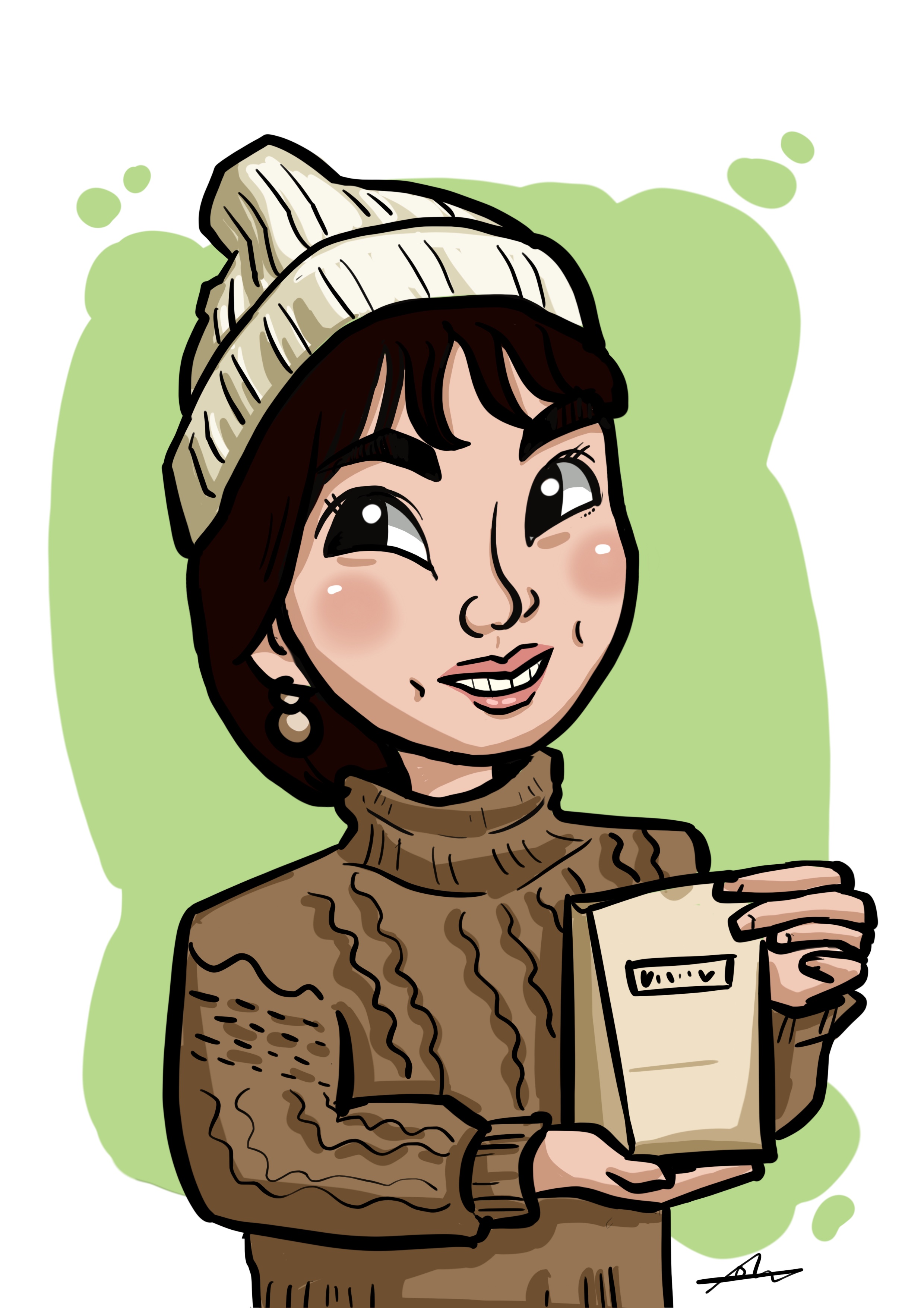귀엽게 곰돌이 스웨터를 입으시고, 귀를 잡고 계신 모습 그림을 그렸네요